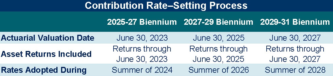 Under current law, contribution rates are adopted every two years and follow the rate-setting process displayed in the table below.