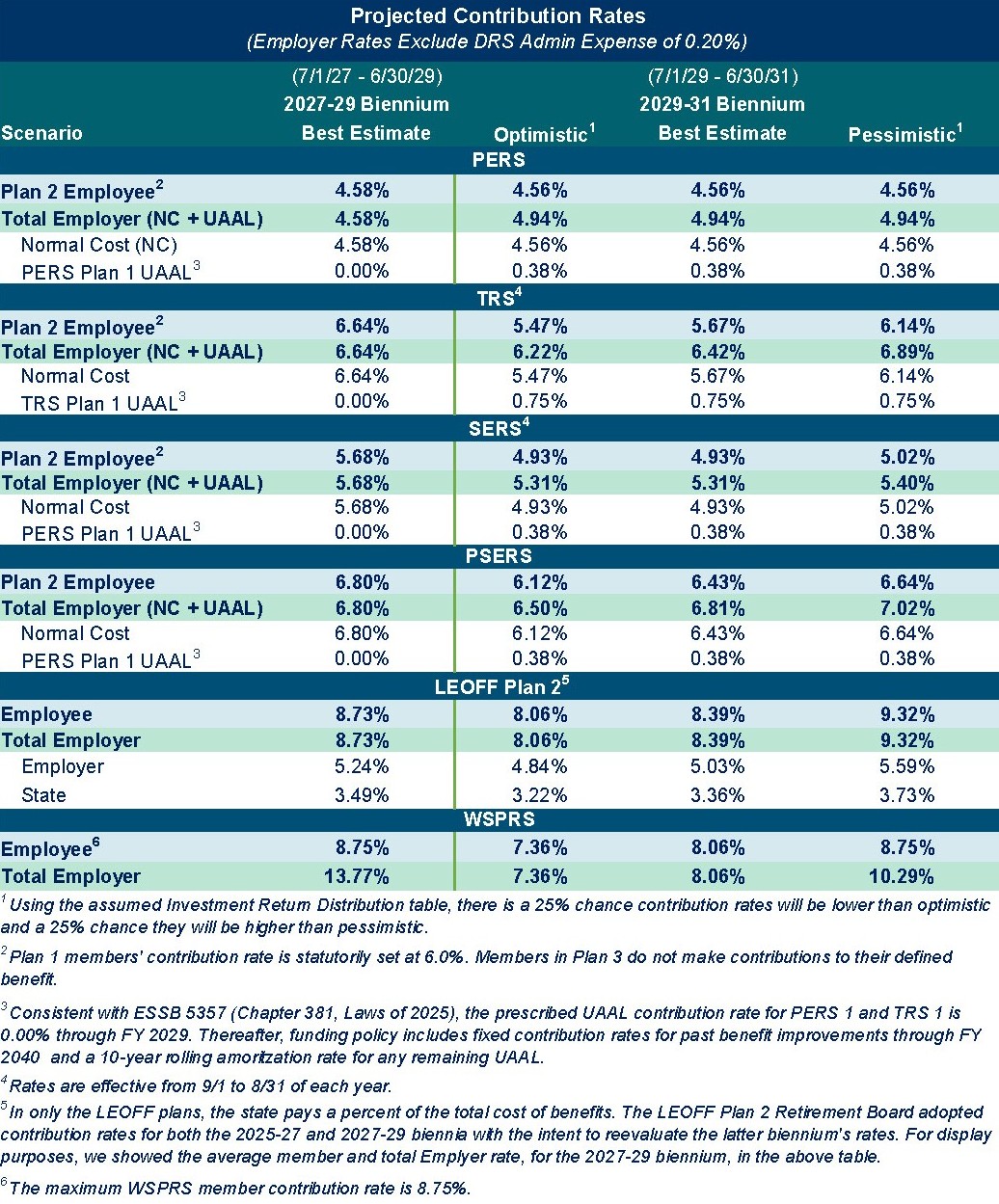 In the following table, we provide projected contribution rates for the 2027-2029 biennium and 2029-31 biennium. These contribution rates are based on our most recent projections model as of the publication date of this webpage, the 2024 Valuation Projections Model. The data, assets, assumptions, and methods used in this model are summarized on our Projections Model and Assumptions webpage.